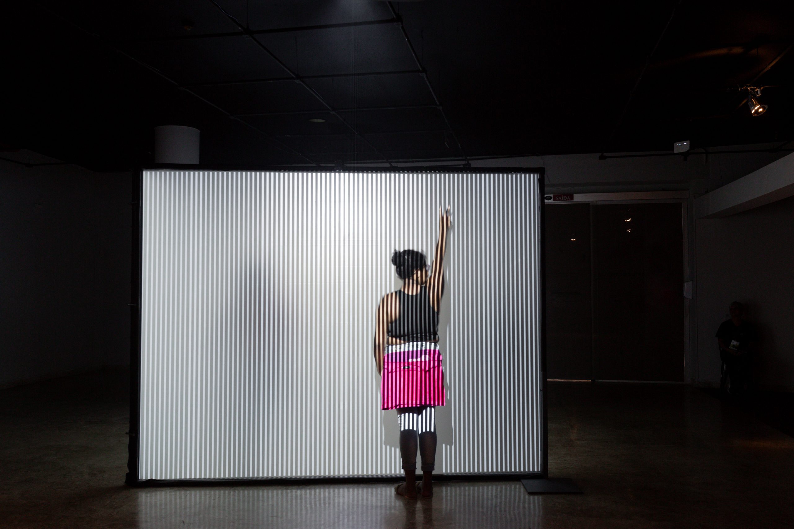 A instalação é composta por três grandes telas de 3,25m por 2,49m, que formam o volume de um cubo aberto, preenchido por centenas de linhas virtuais semelhantes às cordas de um violino. Afinadas com a tensão ideal, essas “cordas” vibram em frequências de luz e som que se transformam conforme a interação do público. Cada movimento, som ou gesto realizado pelos visitantes é traduzido em respostas visuais e sonoras em tempo real, criando uma experiência imersiva e única.